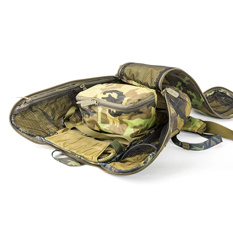 - Main compartment is accessible by a zipper running alongside the backpack, thus creating a front flap which can be fully opened. This solution allows for great orientation in stored material.